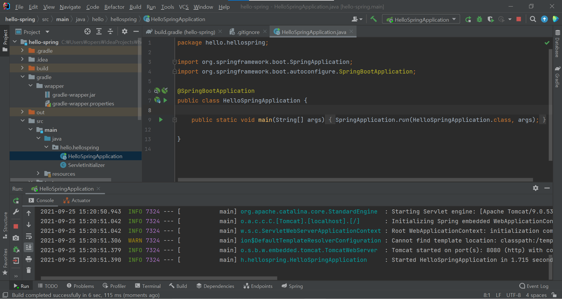 그리고 스프링 자체에 내장된 톰캣이 8080 포트에서 시작했다는 것을 볼수 있습니다.
