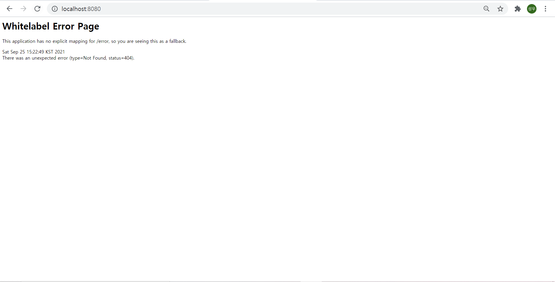 이러한 식으로 오류페이지가 뜨면 환경설정이 완료되었습니다.