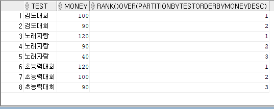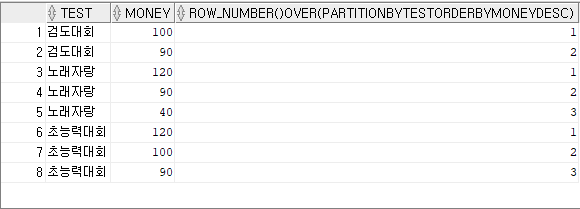 ▶select test,money, ROW_NUMBER() OVER (PARTITION BY test ORDER BY money desc) from prize;