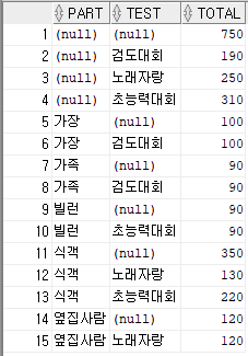 ▶select part,test,sum(money) as total from prize group by rollup(part,test);