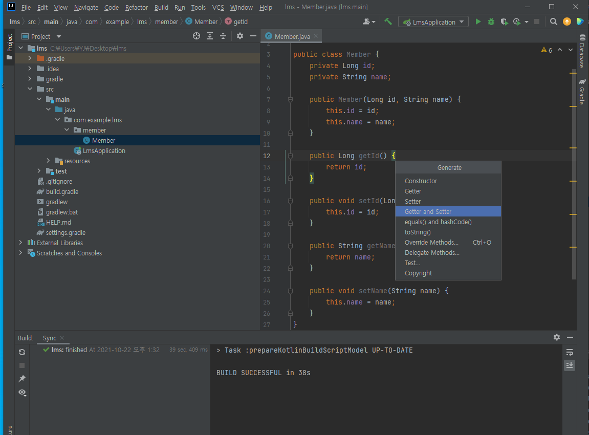 * Alt+Insert 단축키를 통해 generator에서 생성자와 gettersetter를 손쉽게 만들 수 있다.