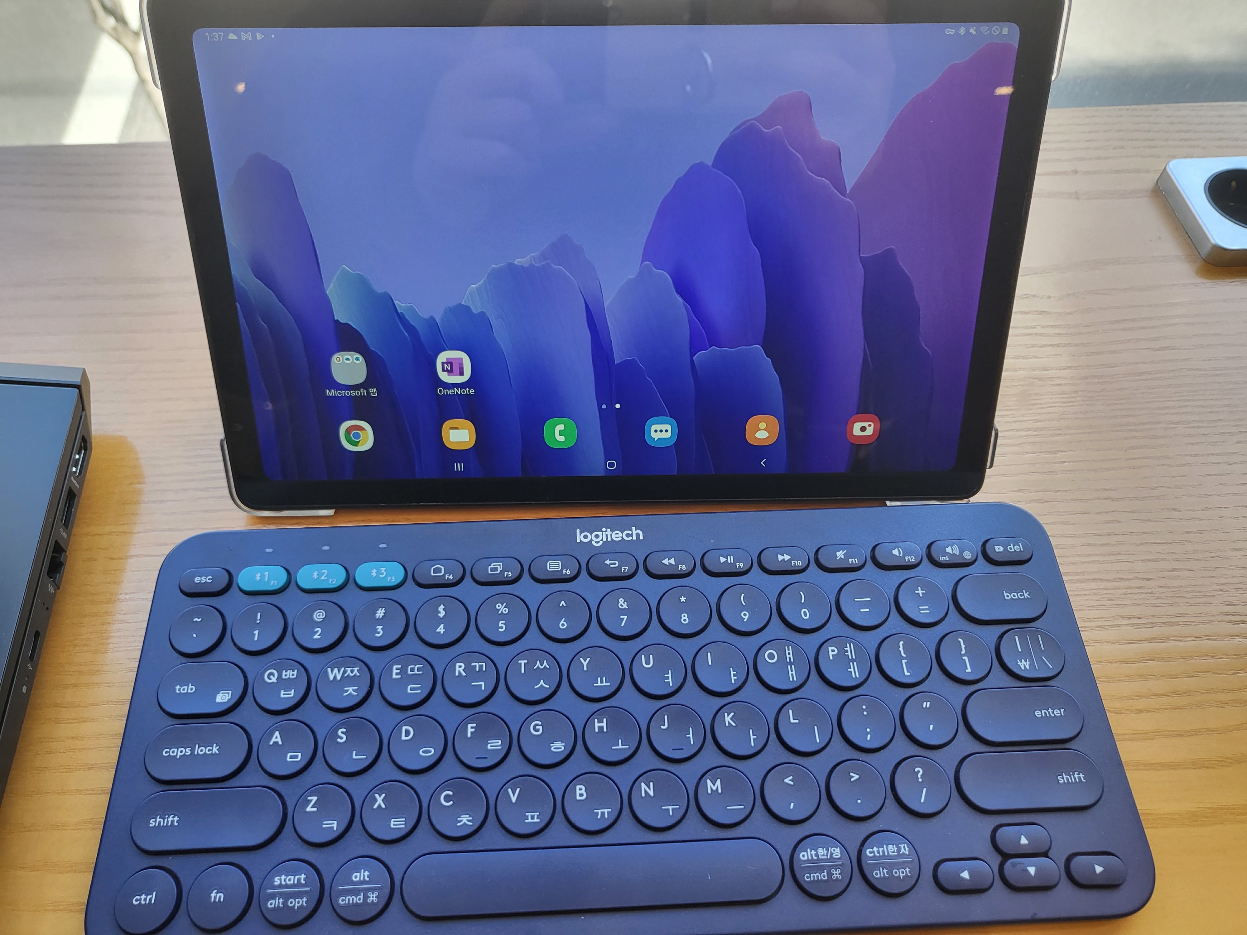 제가 현재 가지고 있는 테블릿은 갤럭시 a7입니다. 개 구졌기 때문에 현재 이 키보드를 쓰면 뚝뚝 끊기는 느낌을 받는데 다른 더 좋은 프로세서를 가지고 있는 친구들을 사용해보면 잘 사용됩니다. 그렇기에 만약 연결이 안정적이지 않다면 불량이거나 아니면 키보드가 연결된 제품의 프로세서가 개구지진 않은지 의심해보시면 됩니다.