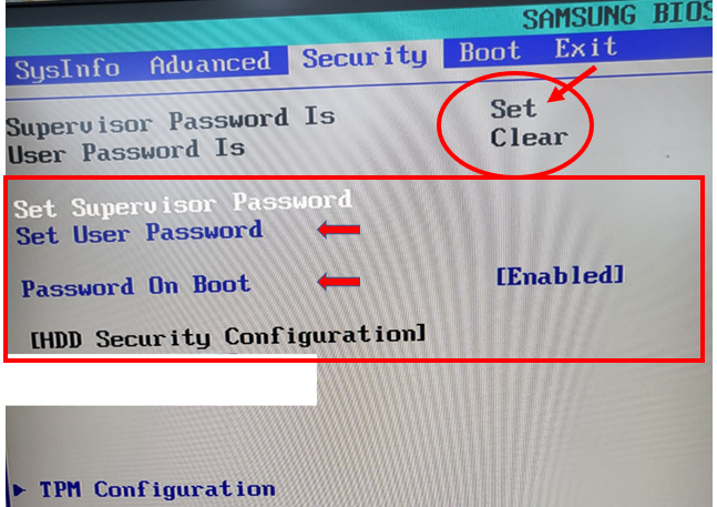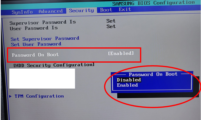 Set User Password와 Password On Boot 항목이 활성화되는 것을 볼 수 있습니다.