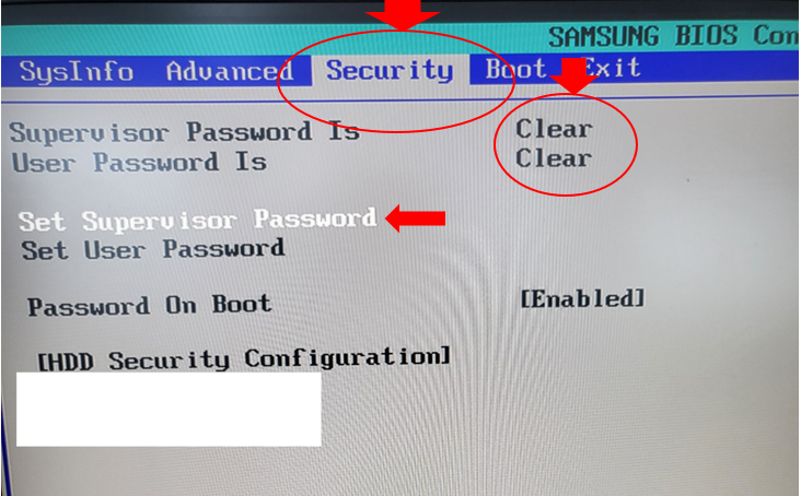 만약, 현재 패스워드가 세팅되어 있지 않다면 Set Supervisor Password 항목만 활성화되어 있는 것을 볼 수 있습니다.
