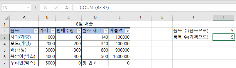 하지만 월초 재고 열 (D열)을 범위로 지정해준다면 두리안의 월초재고에는 숫자가 아닌 텍스트가 들어가 있으므로 해당 셀은 제외한 4를 표시합니다
