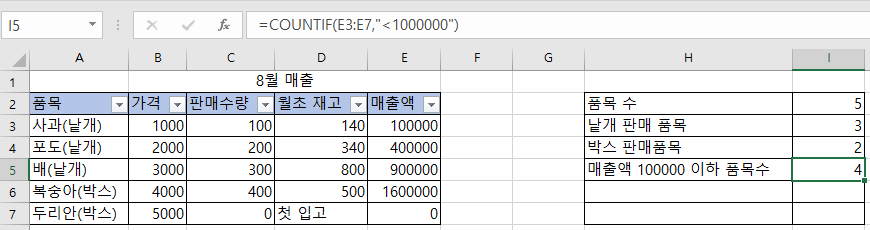 부등호를 사용하여 매출액이 1000000 이하인 품목의 개수를 셀수 있습니다.