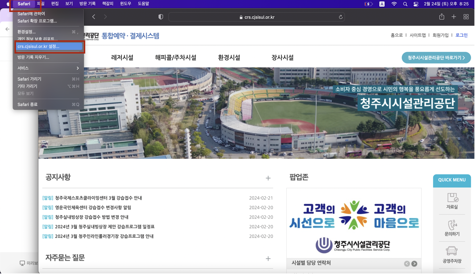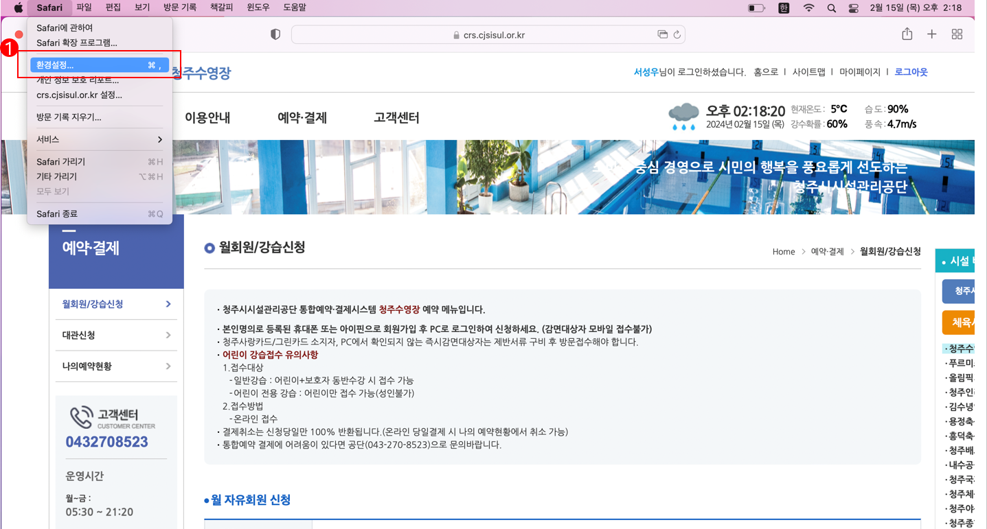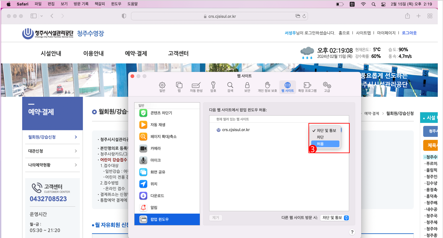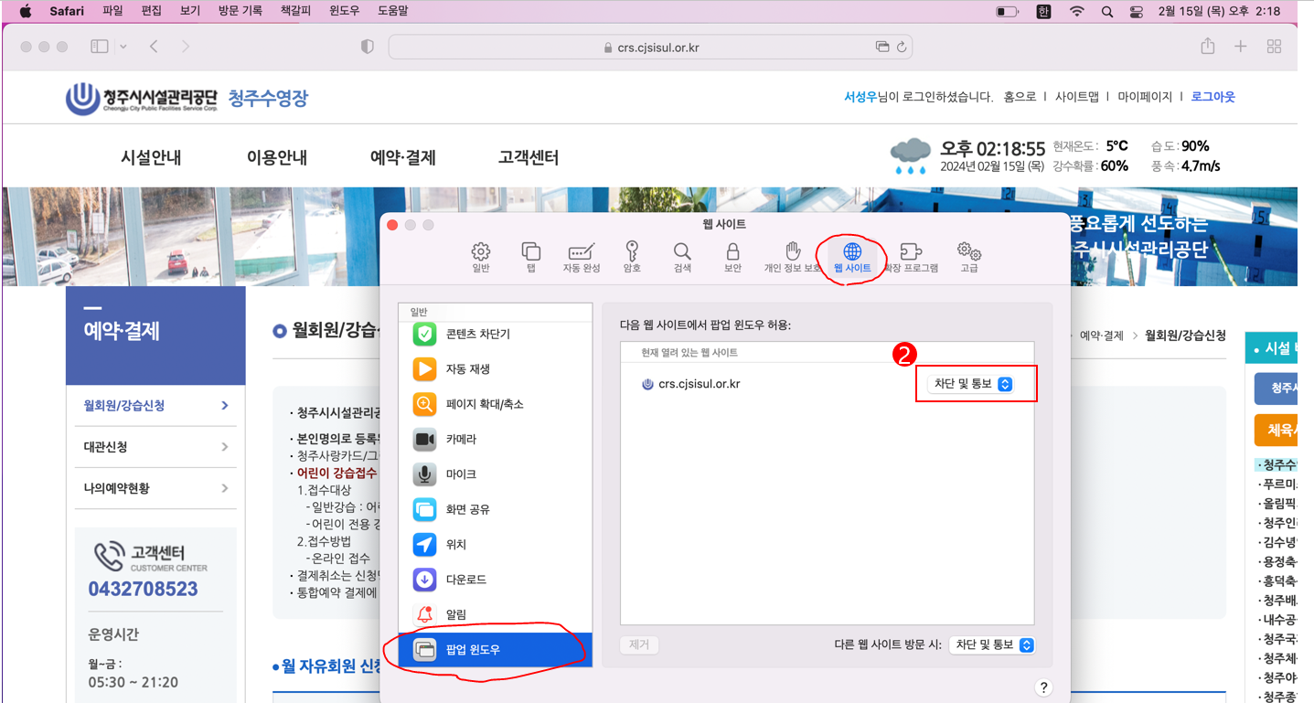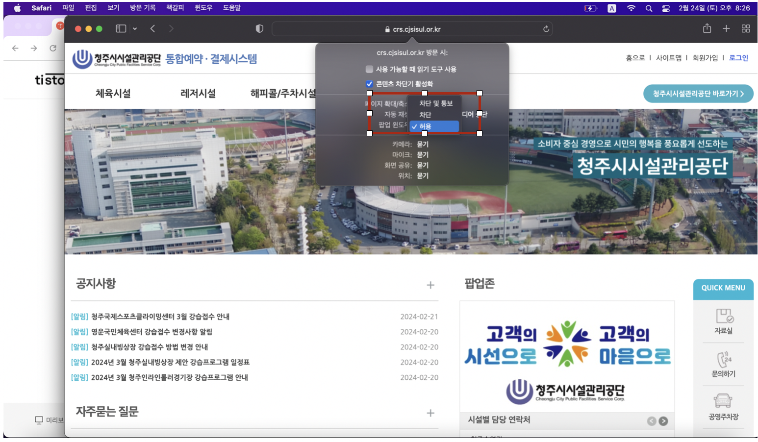 사파리로 청주시 수영장 강습회원 결제 시 팝업이 차단되어 결제창이 열리지 않습니다.