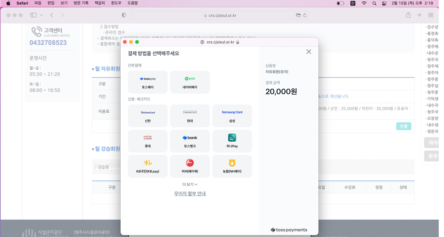 예제로는 결제를 팝업으로 진행하는 청주시 시설공단 예약시스템의 청주수영장으로 잡았습니다.