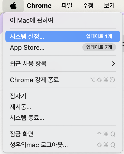 맥북 상단의 메뉴바에서 사과아이콘을 눌러 시스템 설정으로 이동합니다.