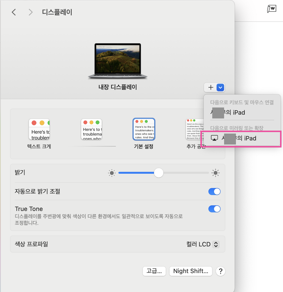 정상적으로 연결이 되었다면 위의 스크린샷과 같이 디스플레이에 자신의 MAC북과 iPad가 연결되었음을 볼수 있습니다.