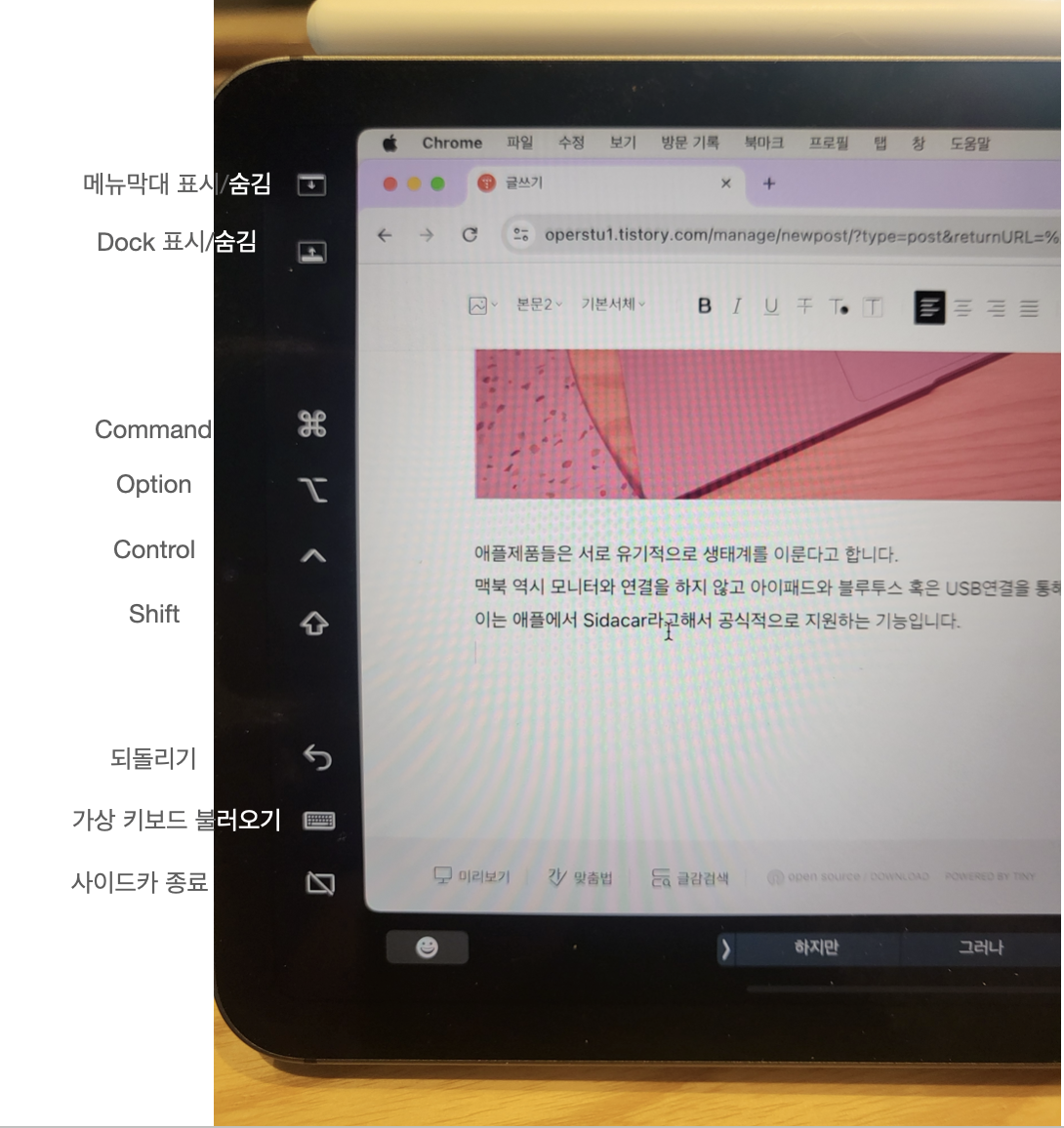 맥북의 사이드카로 아이패드를 설정하면 아래의 스크린샷과 같이 좌측혹은 우측에 사이드바가 생겨납니다.