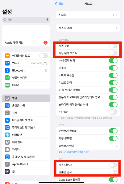 (1) 모든 키보드 항목 내 '자동 수정', '자동 완성 텍스트', 언어 항목 내 '자동 대문자', '맞춤법 검사' 해제합니다.