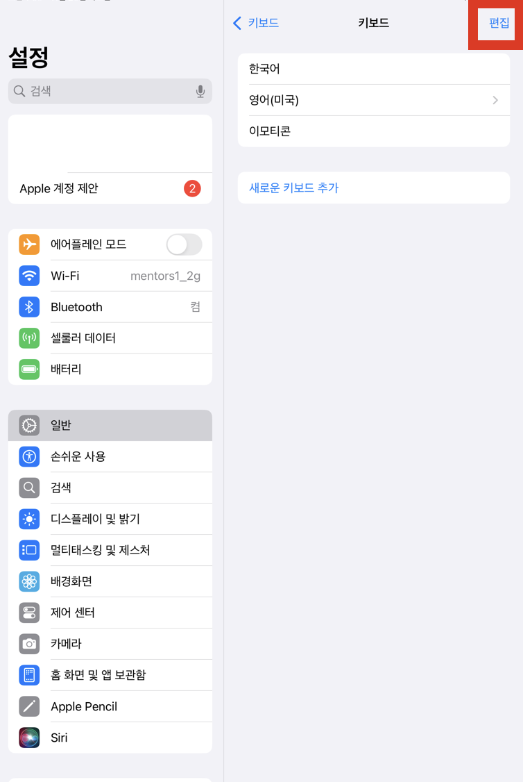 (2) 편집을 눌러 이모티콘 키보드 제거해줍니다.