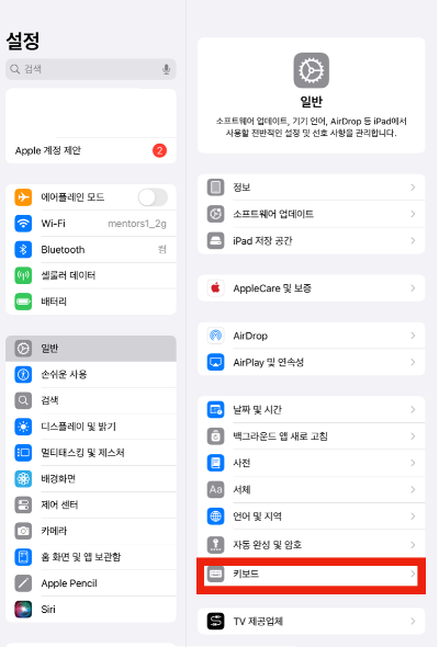 키보드 설정을 하기 위해서는 설정으로 들어가셔서 일반 -> 키보드 항목으로 들어가셔야합니다.