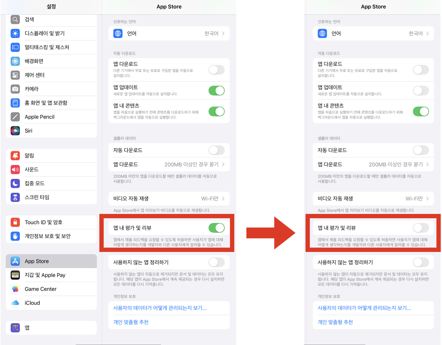 - 평가 요청 끄기: 'App Store' 설정 화면에서 '앱 내 평가 및 리뷰' 옵션을 찾아 토글을 끔으로 변경합니다.