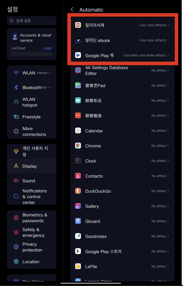 2)자동 활성화 설정: 특정 앱(전자책 리더, PDF 뷰어) 실행 시 자동으로 활성화되도록 설정합니다.