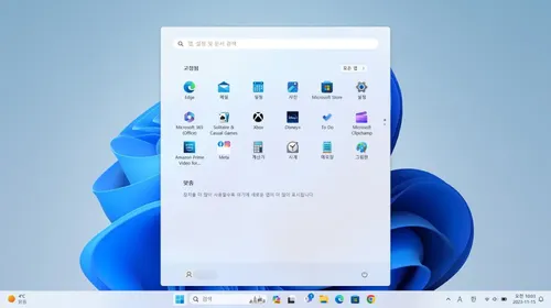 - 작업표시줄과 시작 메뉴가 중앙 정렬된 깔끔하고 현대적인 디자인.