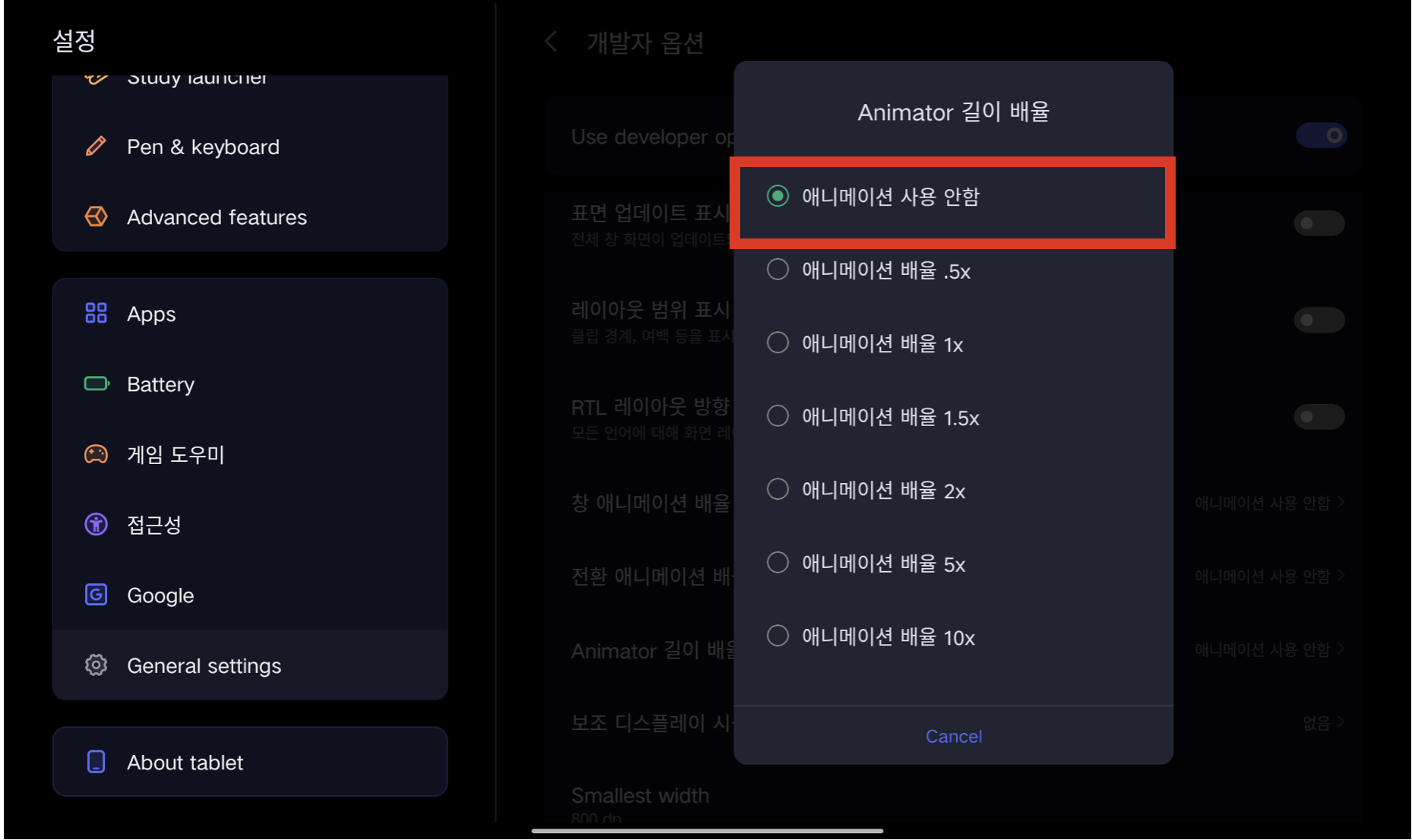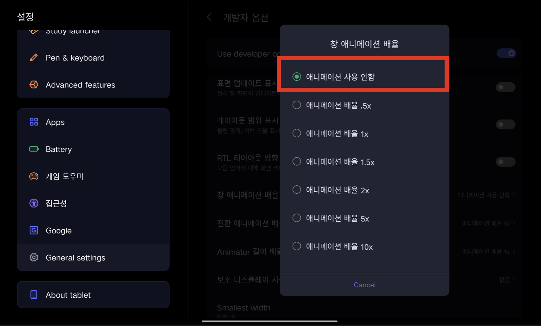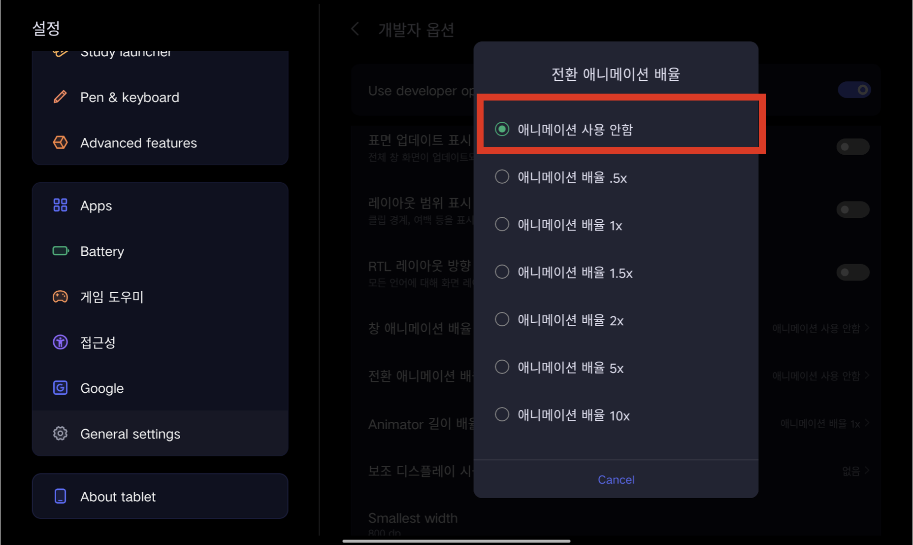 - 애니메이션 배율: "0.5x" 또는 "꺼짐"으로 설정.