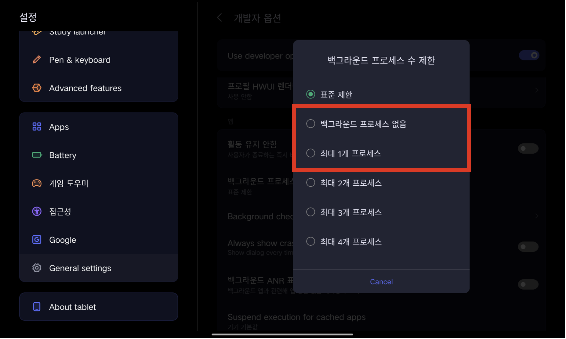두 항목 모두 처음에는 비활성화되어있을겁니다. 활성화해주세요 - 앱 백그라운드 제한: 백그라운드에서 실행 중인 앱 수를 제한