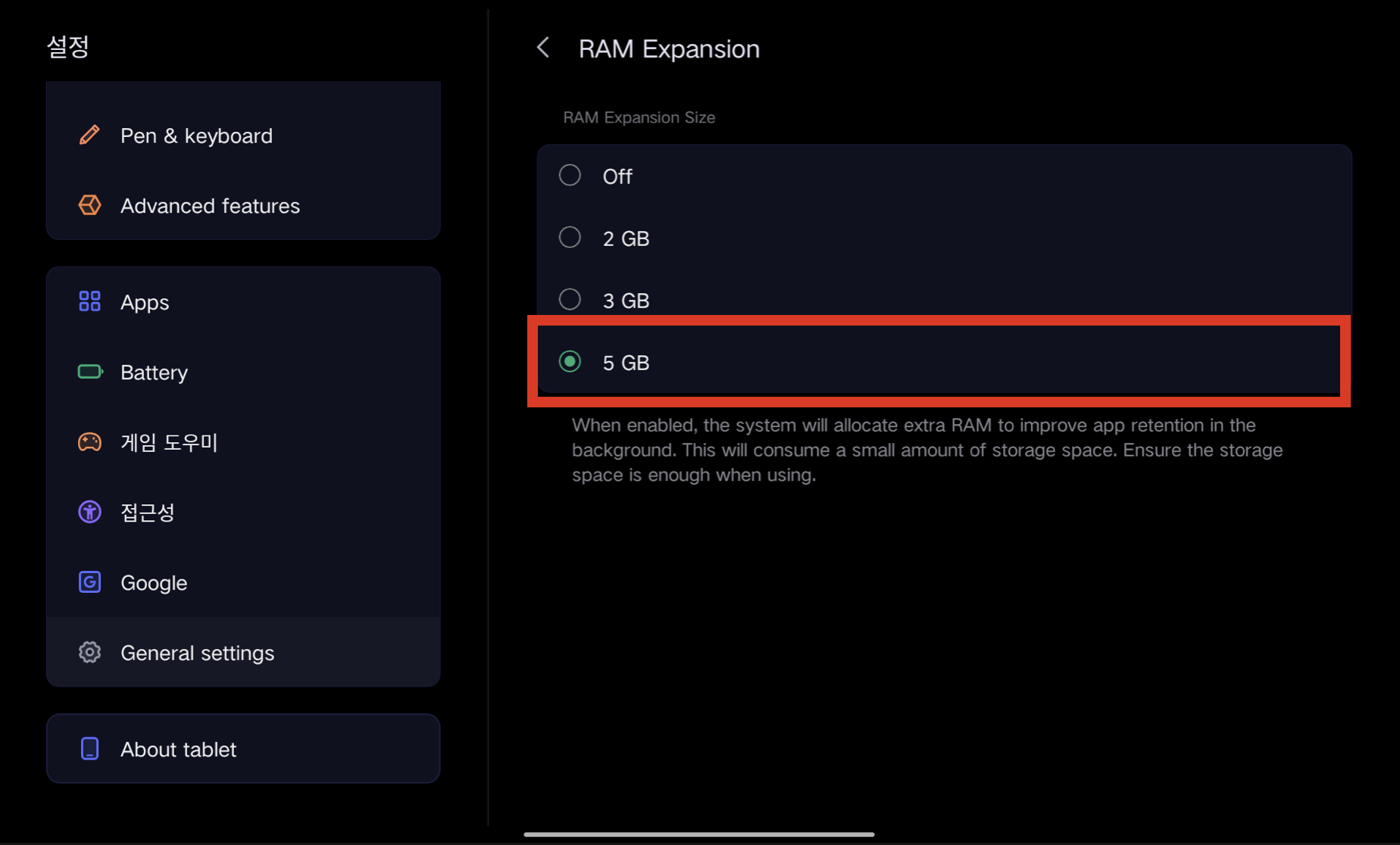 - 설정 → 시스템 → "RAM 확장" 으로 이동.