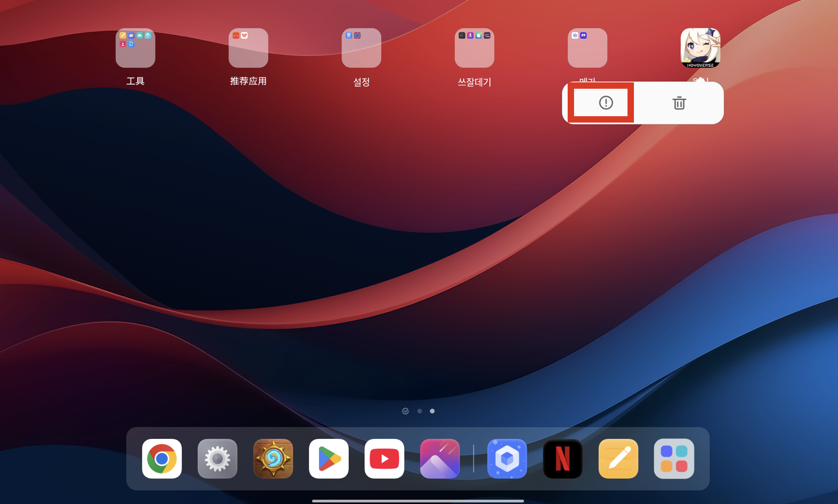 게임 앱을 꾹 눌러 느낌표를 눌러 환경설정으로 들어갑니다.