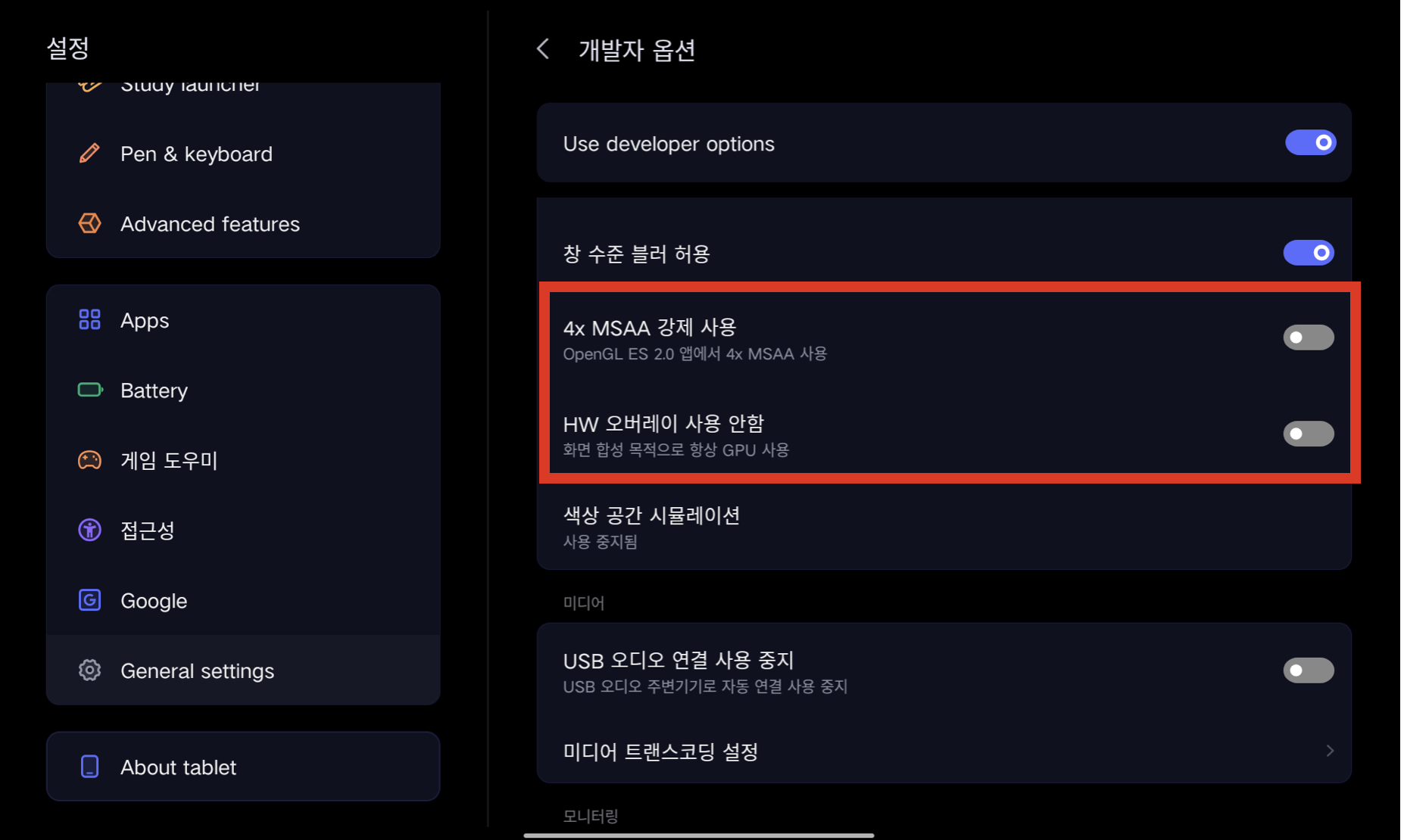 ※ 주의하실 점은 '강제 4X MSAA' 나 'HW 오버레이 사용 안함'과 같은 옵션은 디바이스 성능에 부정적인 영향을 미칠 수 있습니다. 게임이 끝난 후 기본 설정으로 돌려놓는 것이 좋습니다.