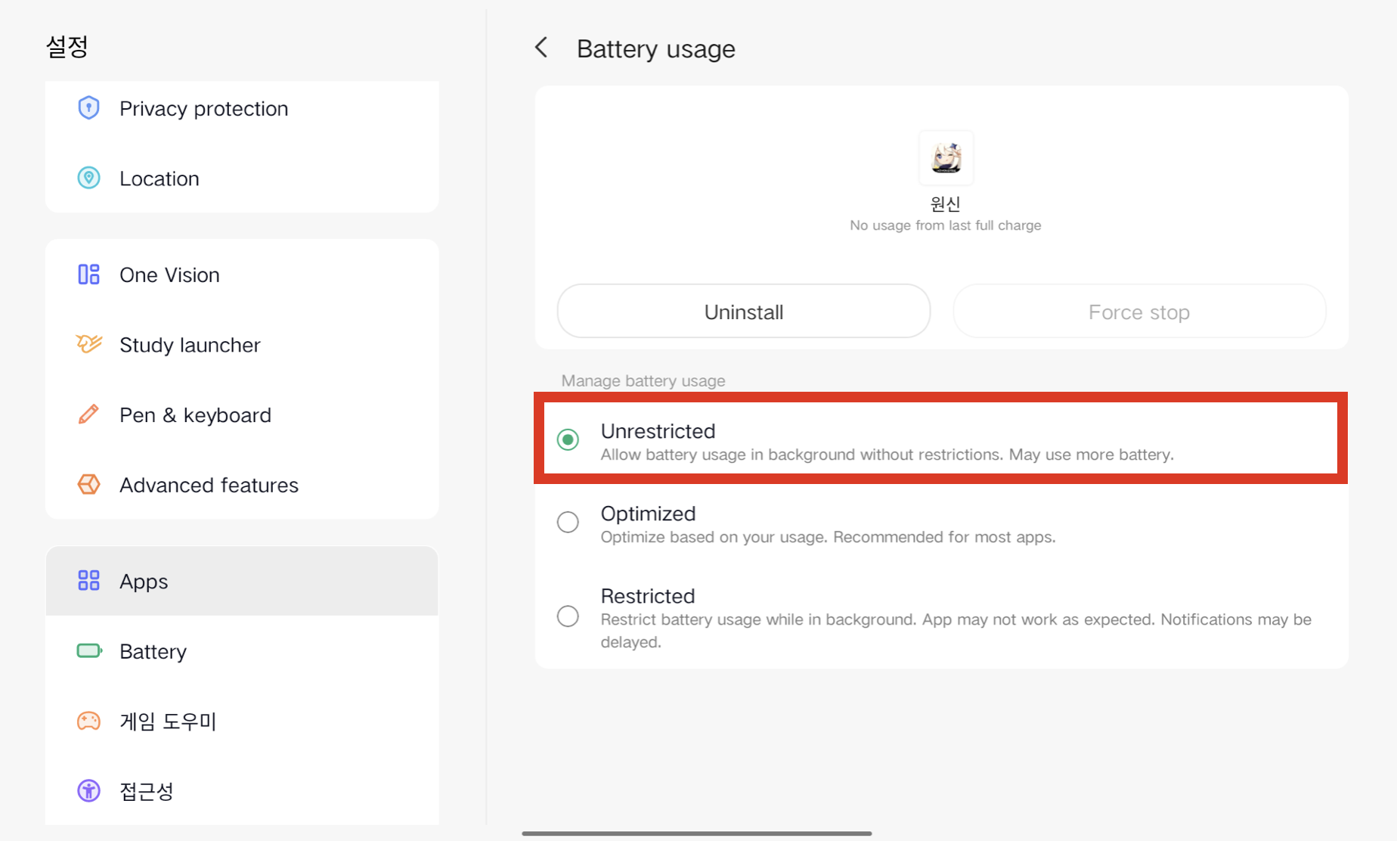 배터리 성능 제한없음을 선택합니다.