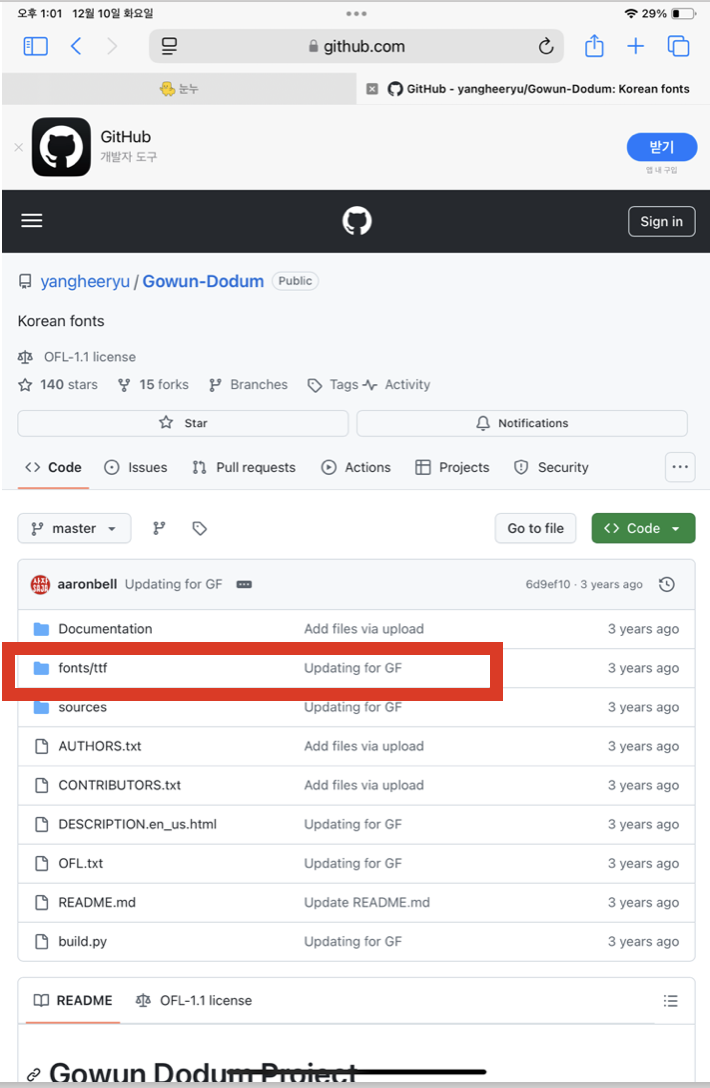 ④fonts/ttf폴더로 들어가서 폴더 안의 파일을 다운로드 받습니다.
