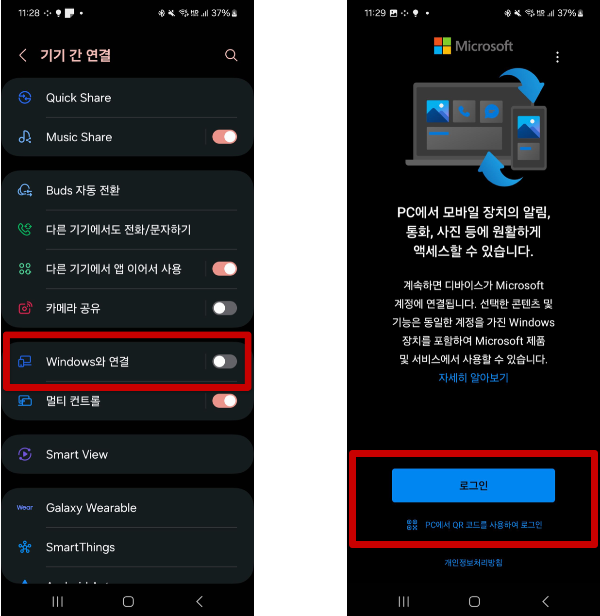 윈도우와 연결 활성화 후 로그인 혹은 QR코드 사용하여 로그인을 합니다. 어디를 눌러도 어차피 로그인해야합니다.