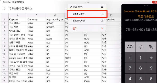 - Split View 밑에 있는 Slide Over를 사용하면 세개의 화면을 사용할 수 있습니다. 주로 저는 계산기를 사용할 때 사용합니다.