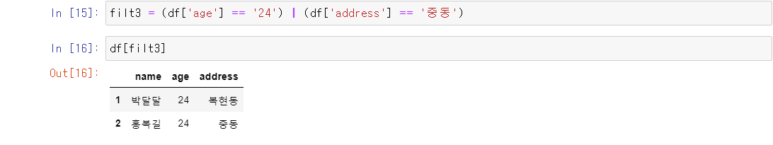 ***&나 | 없이 필터를 하나의 조건식으로 작성할 때는 조건식 별로 괄호를 해줄 필요가 없으나(ex)filt=df['age']=='24')