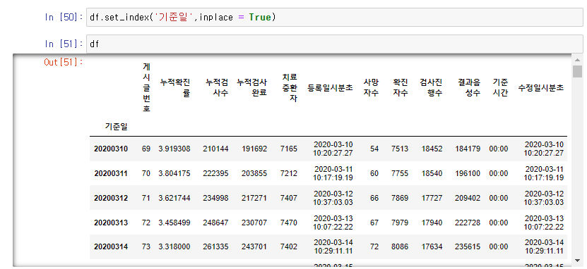 이제 df.set_index('기준일',inplace = True)를 통해 인덱스 값을 기준일로 바꿔줍니다.