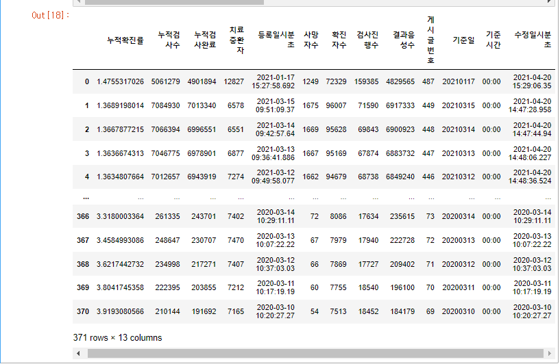 371rows와 13개의 column을 가지고 있는 코로나 관련 공공데이터를 가지고 왔습니다.