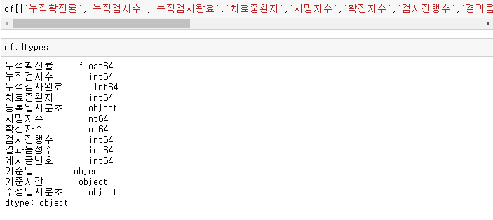 df[['누적확진률','누적검사수','누적검사완료','치료중환자','사망자수','확진자수','검사진행수','결과음성수','게시글번호']] = df[['누적확진률','누적검사수','누적검사완료','치료중환자','사망자수','확진자수','검사진행수','결과음성수','게시글번호']].apply(pd.to_numeric)