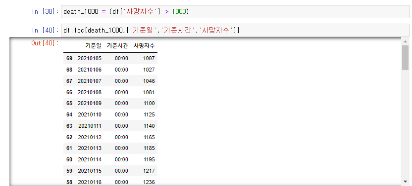 그렇다면 이렇게 필터를 짜고 df.loc를 실행해 주면 되겠지요.