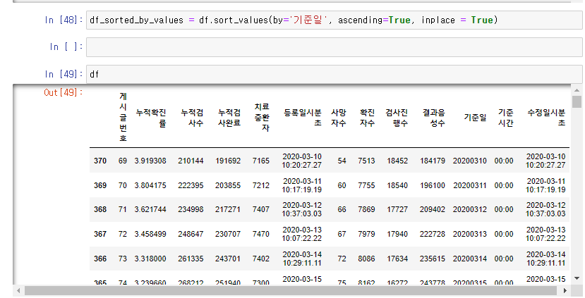 df.sort_values(by = '기준일', ascending = True, inplace = True)