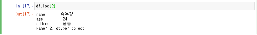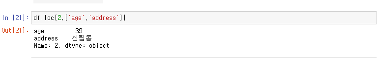 df.loc을 이용해 2번으로 들어가서 'age'와 'address'부분을 가지고 와 줍니다.
