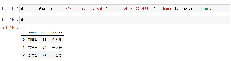 원래 이름으로 다시 변경하고 싶다면 rename을 쓰셔도 됩니다. inplace = True 는 다들 아시겠지만 이 것을 해야 원 데이터에 반영됩니다.