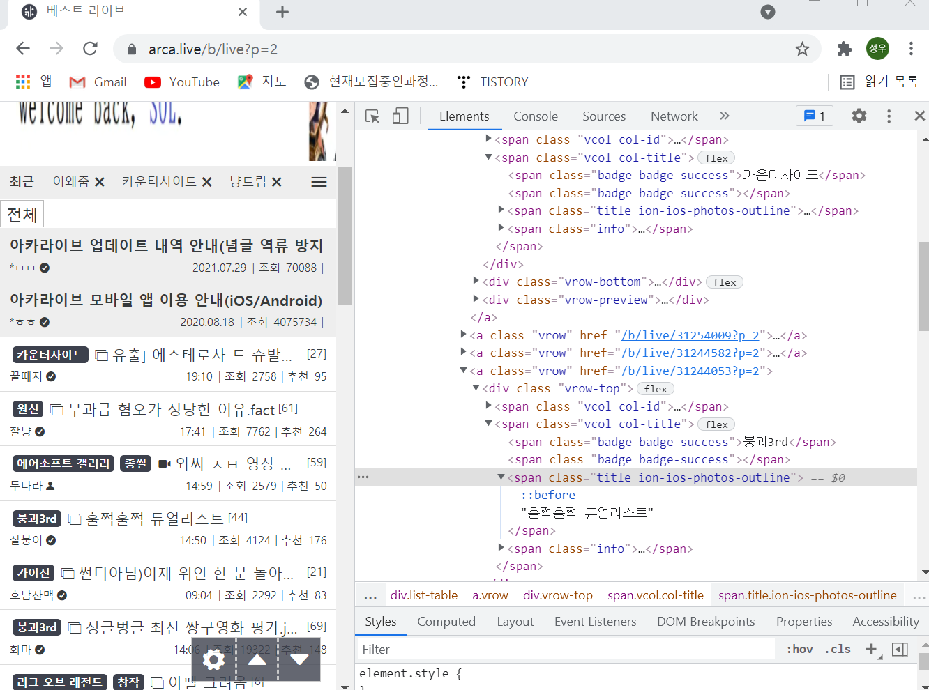 게시판의 주소는 arca.live/b/live?p=2