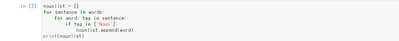 그래서 태그가 noun인 단어들을 if 조건문으로 선별하여 추가해줍니다.
