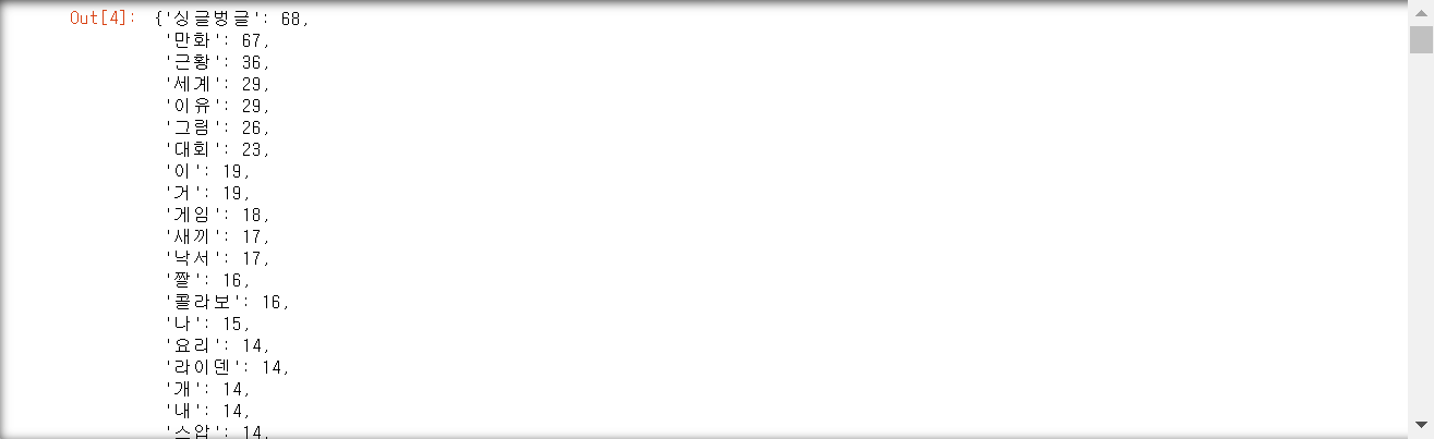 다음으로 Counter 라이브러리를 활용하여 안에 들어 있는 명사들의 빈도수를 dic형으로 만들고 다시