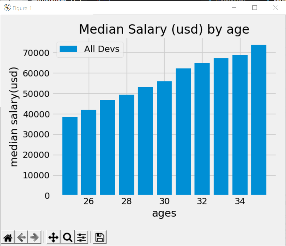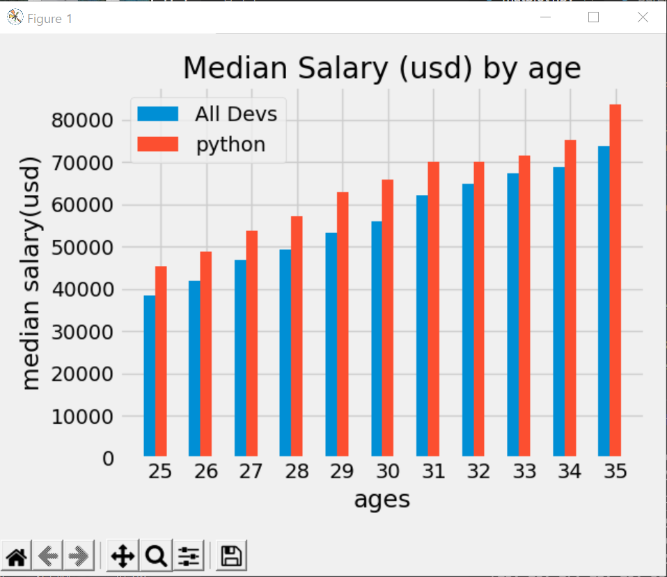 그리고 plt.bar()에 age_x대신에 x_indexes와 x_indexes - width를 각각 넣어줍니다. 그렇게 하면 아래에 dev_y 는