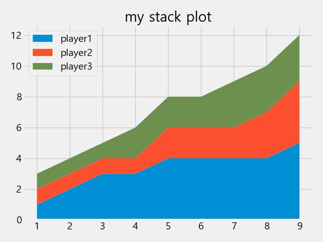 plt.stackplot(minutes,player1,player2,player3, labels = labels, colors=colors)