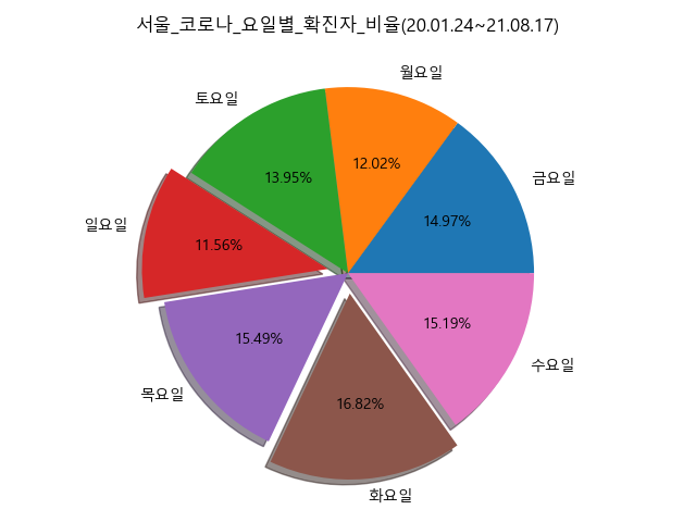 *pie chart를 이용하여 요일별 확진자 비율을 시각화해 보았습니다.