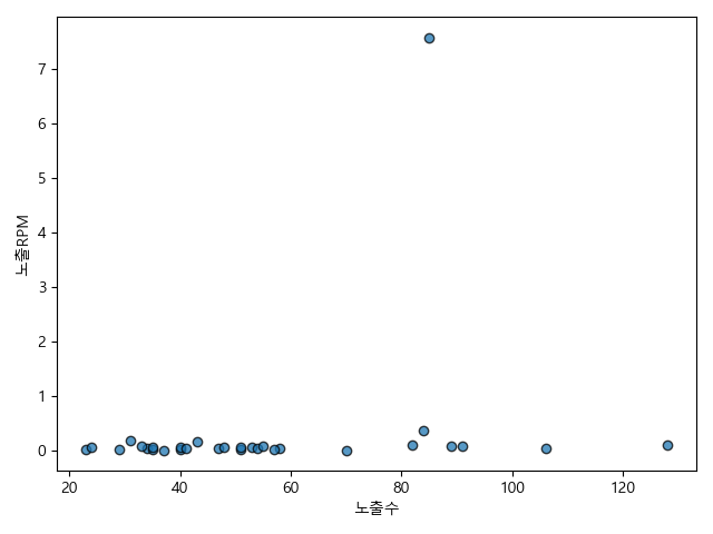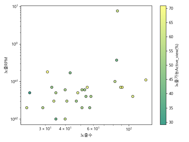완성된 산점도를 통해서 보았을 때, 노출수와 노출RPM의 관계는 당연하게도 양의 상관관계를 가지고 있기는 한데 그 강도가 생각보다 약하다는 것을 알 수 있습니다.
