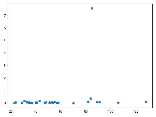 산점도는 plt.scatter(x,y)를 통해서 그릴 수 있습니다.